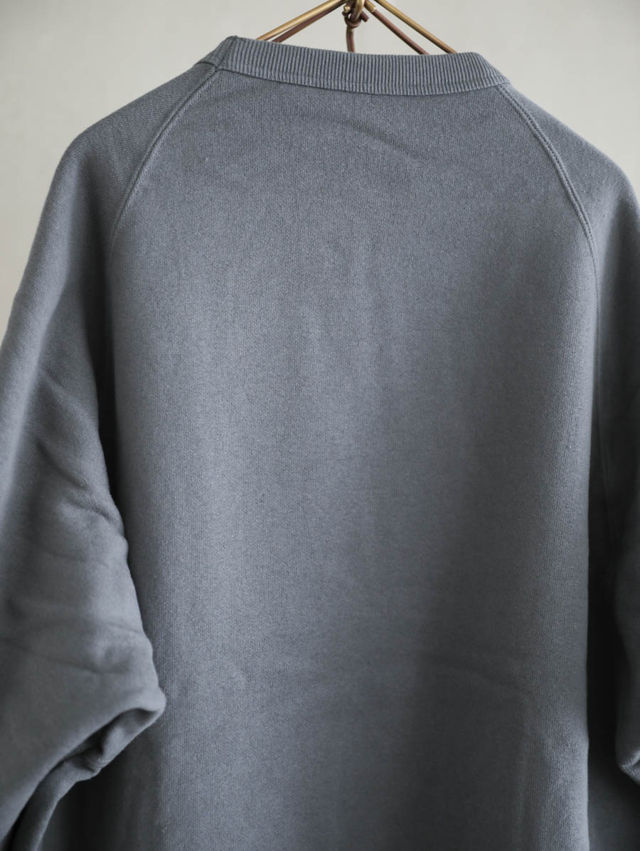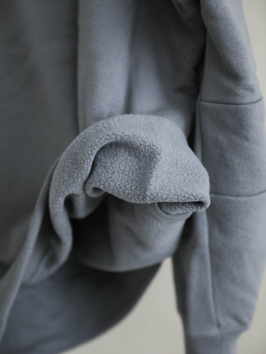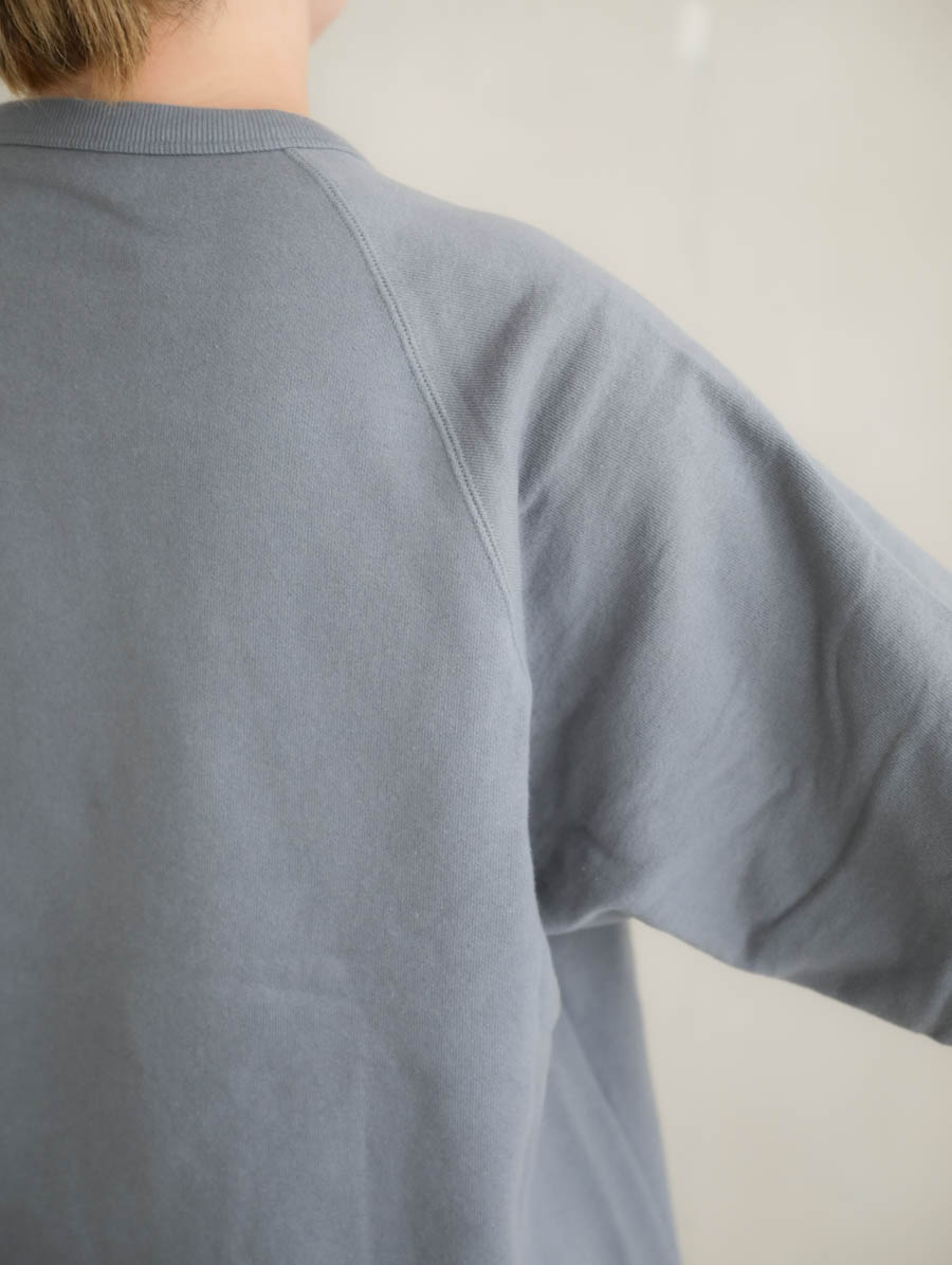 吊り編み機でしっかりと度詰めに編まれた裏起毛スウェット。柔らかくて軽い生地は着用のストレスもなく、裏側はホワッと起毛し心地よい温かみを感じていただけます。袖を通してみると、しっかりと安心感があるのに軽い、これから寒くなる季節に重宝します。