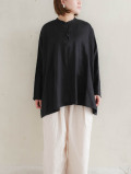前後の境目がなくなっていくような、すっきりとミニマルな形。肩の縫い目をなくしたドルマンスリーブで腕周りを広く取り、動きやすくきれいに見えるようなパターンで作られています。