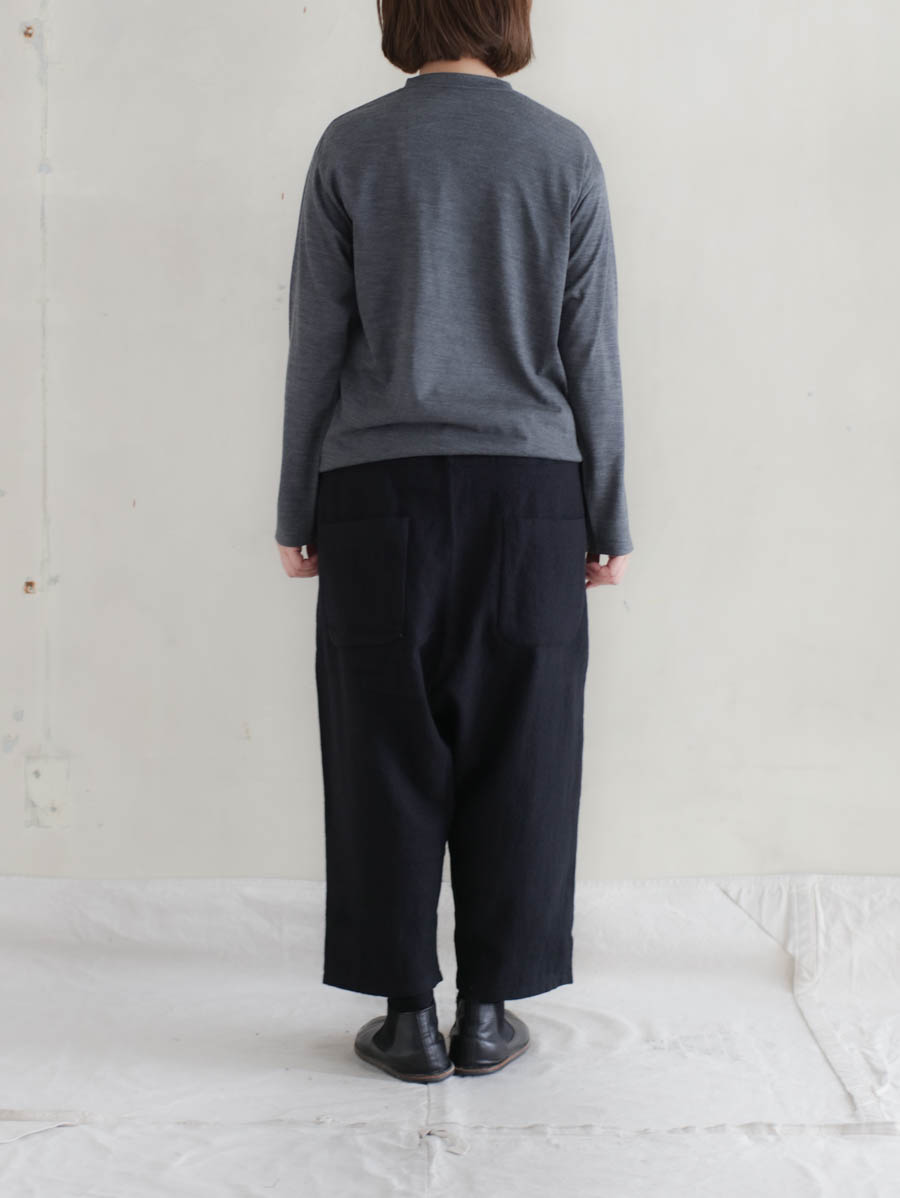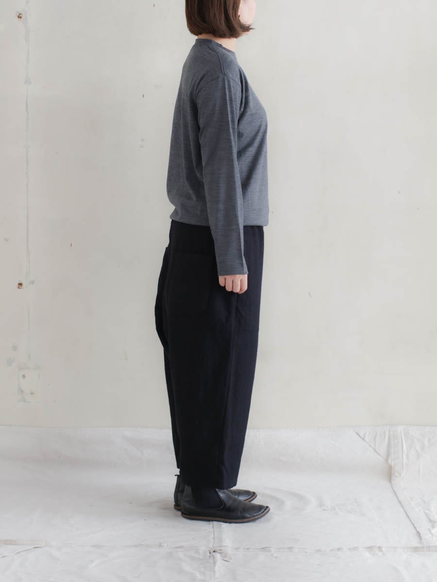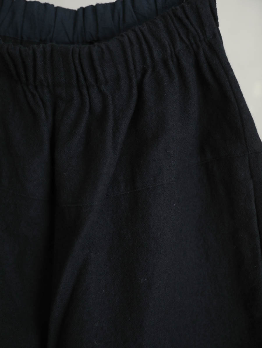 ワイドなシルエットで、リラックス感のある穿き心地。腰回りもゆったりとしていて、タイツやレギンスを下に履いても、もたつくこともなく快適に過ごしていただけます。落ち感のある生地を使用してますので、膨らみ過ぎることもなくきれいなラインです。