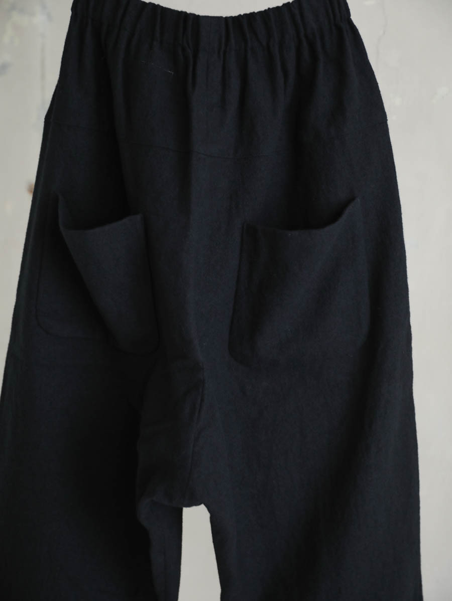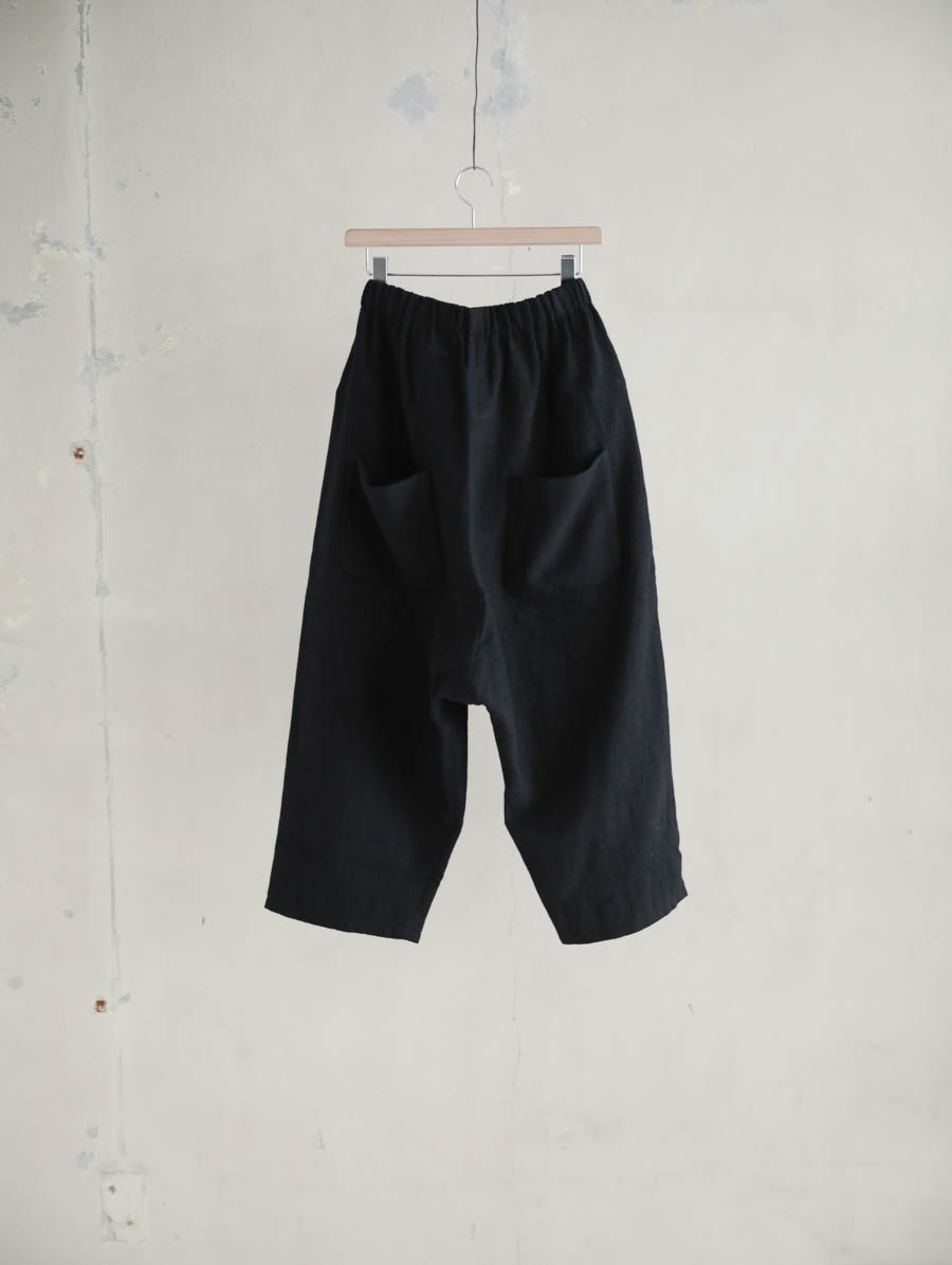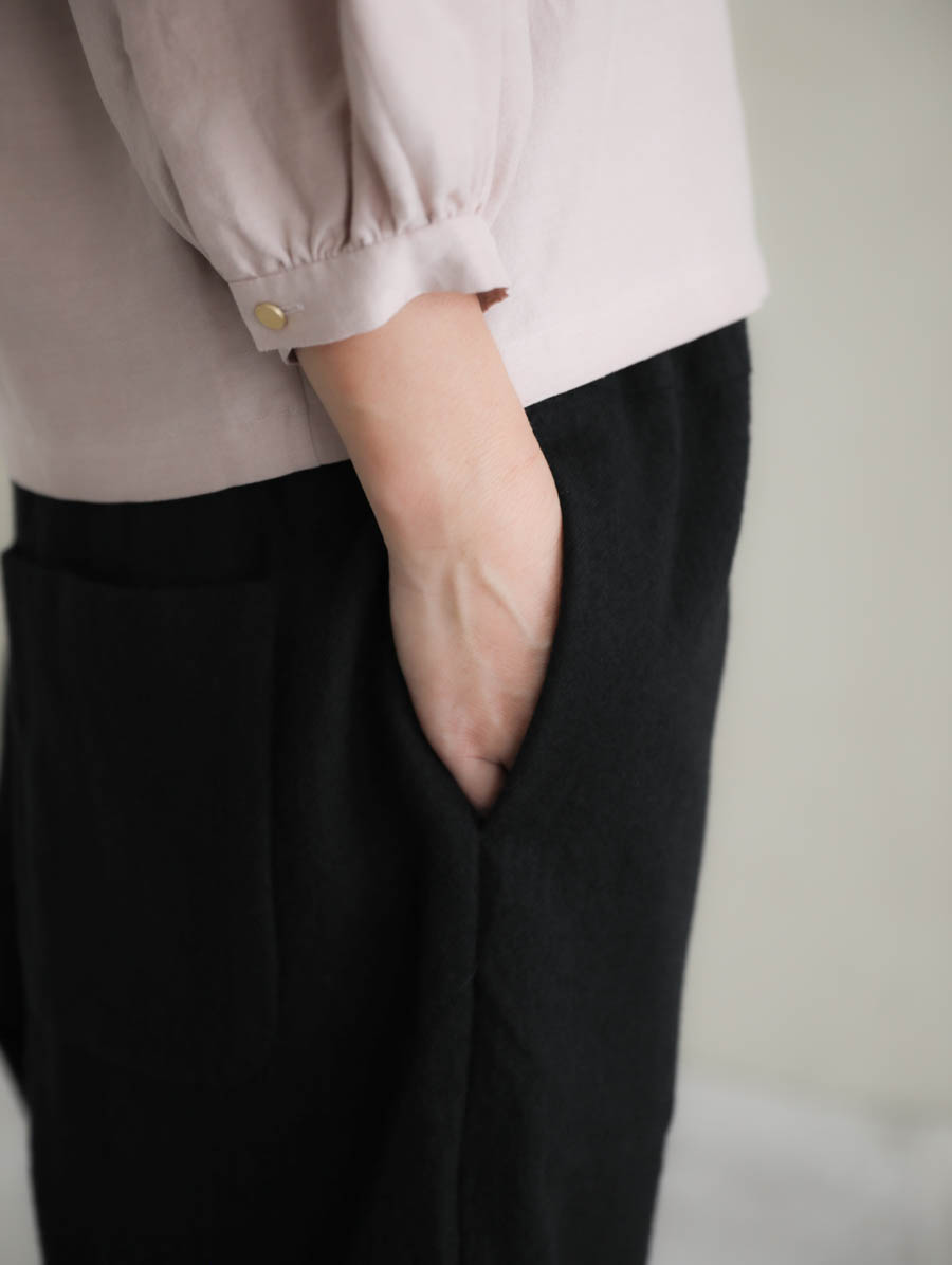 ワイドなシルエットで、リラックス感のある穿き心地。腰回りもゆったりとしていて、タイツやレギンスを下に履いても、もたつくこともなく快適に過ごしていただけます。落ち感のある生地を使用してますので、膨らみ過ぎることもなくきれいなラインです。