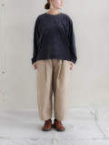 裾に切り替えを入れたデザインが特徴的。ゆったりとしていますが裾は収まりよく、体を丸く包み込むようなコクーンシルエットでご着用いただけます。フロントタックを取って腰回りにゆとりを持たせているので、リラックス感のある履き心地です。
