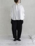 立体的で丸みのあるワイドシルエット。後ろのみゴムを通したイージー仕様で、見た目はすっきりと。裾のストラップでシルエットを絞ることも出来ます。