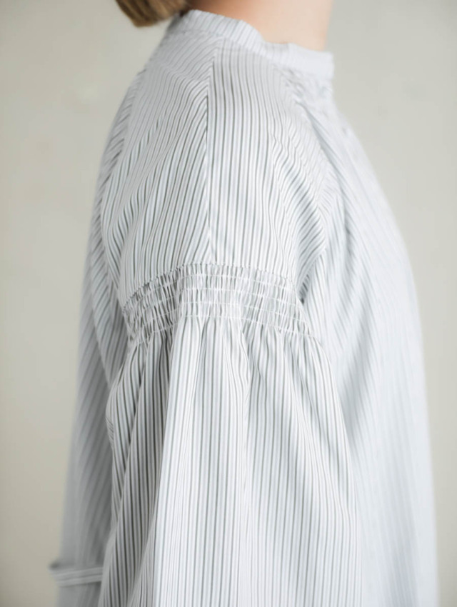 首元にはスモッキング、共地の紐がついているので、シルエットを調節した着こなしも出来ます。