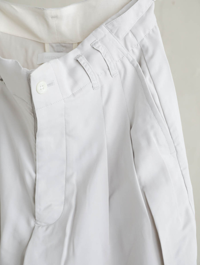 ラフになりすぎないよう、フロントタックやサイドシンチなどフォーマルなディテールを取り入れ、カチッとした要素をプラス。シルクのブラウスや上質なコットンシャツと合わせていただくのもバランスが良いです。