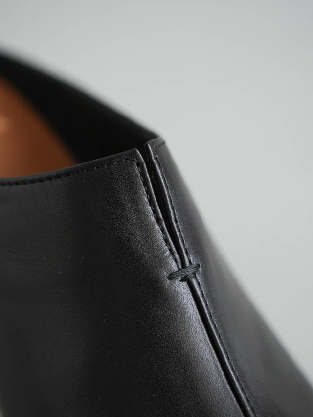 丁寧に鞣されたカーフスキンを使用。靴が出来上がってから一つ一つ磨かれたレザーは、きれいなツヤのある品の良い表情です。裏側にはライニングを付けて柔らかな足あたり。アウトソールには、レザーを使用しています。