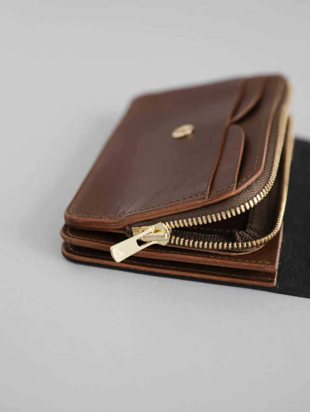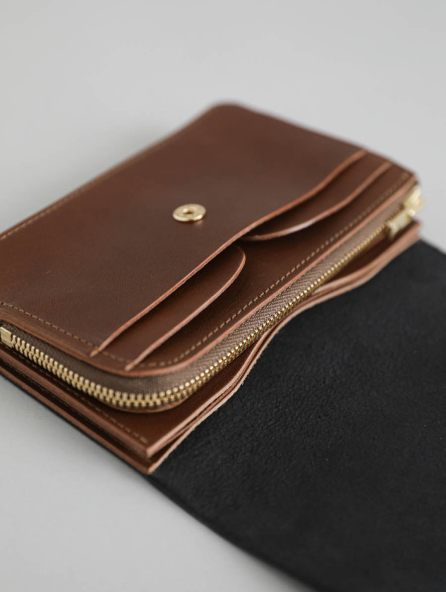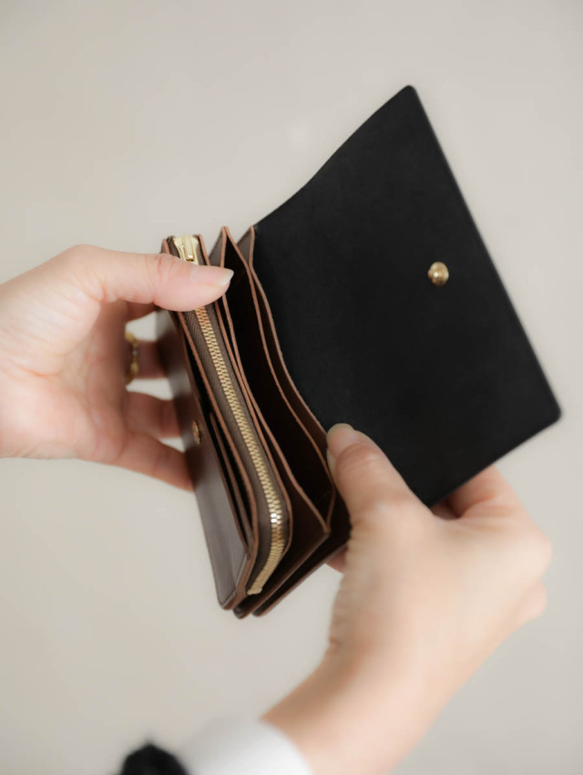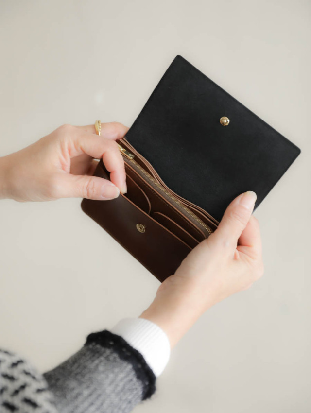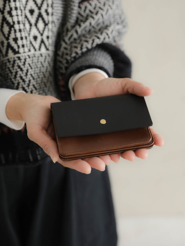 小さなサイズ感ながらもカード、小銭などしっかりとした収納力があり、お札は2つ折りにして収納できます。