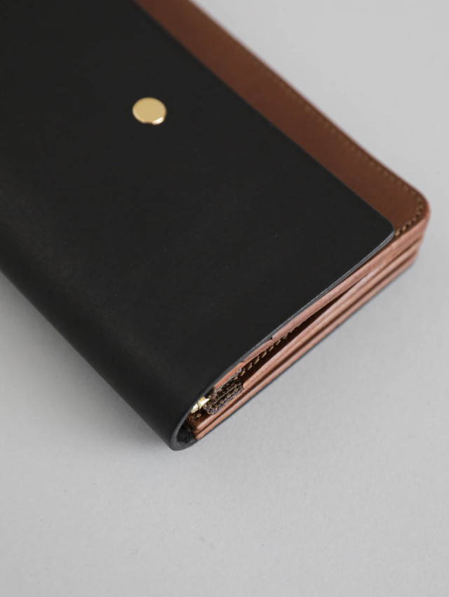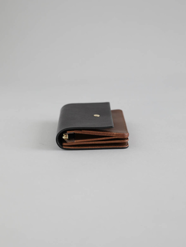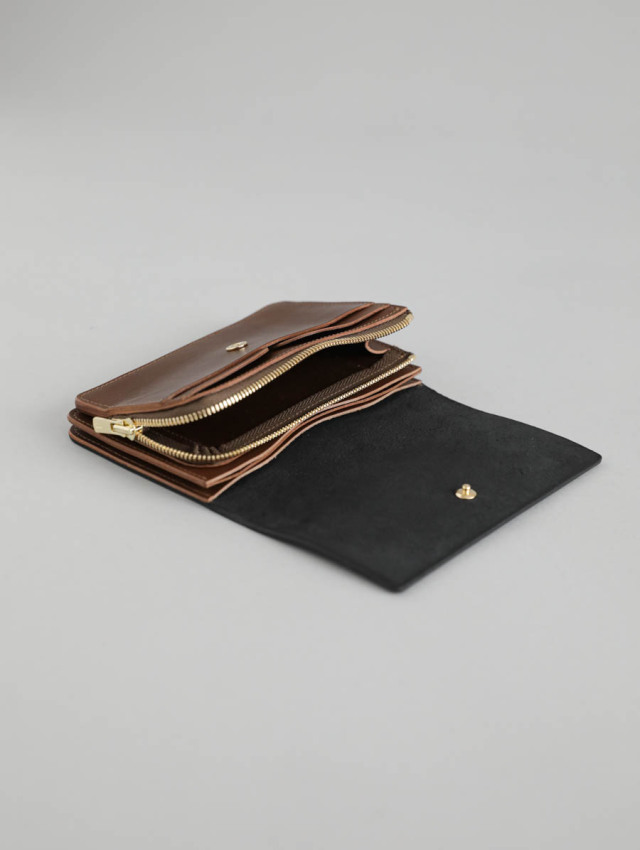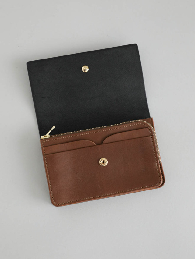 ボタン付きのフラップを開くと手前から順に、カード入れ、ジップ付きコインポケット、2層のスペース。