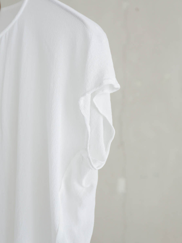 スッキリとした印象のフレンチスリーブ。程よく肌を見せることによって爽やかな印象を与えてくれます。身頃の自然なドレープも優雅な印象に。また、合わせのボタンを外せば、軽めの羽織りしても大活躍です。カジュアルにも上品な装いにも、シーンを選ばすお楽しみいただける一着。夏に向けておすすめしたいアイテムです。