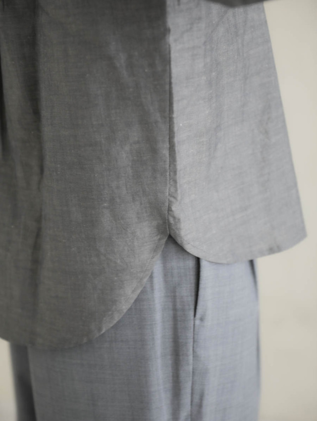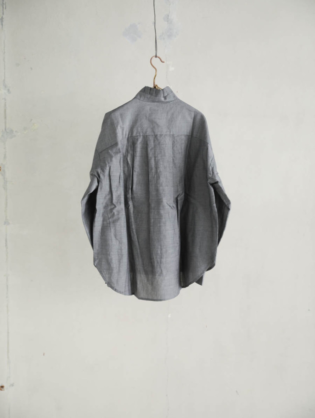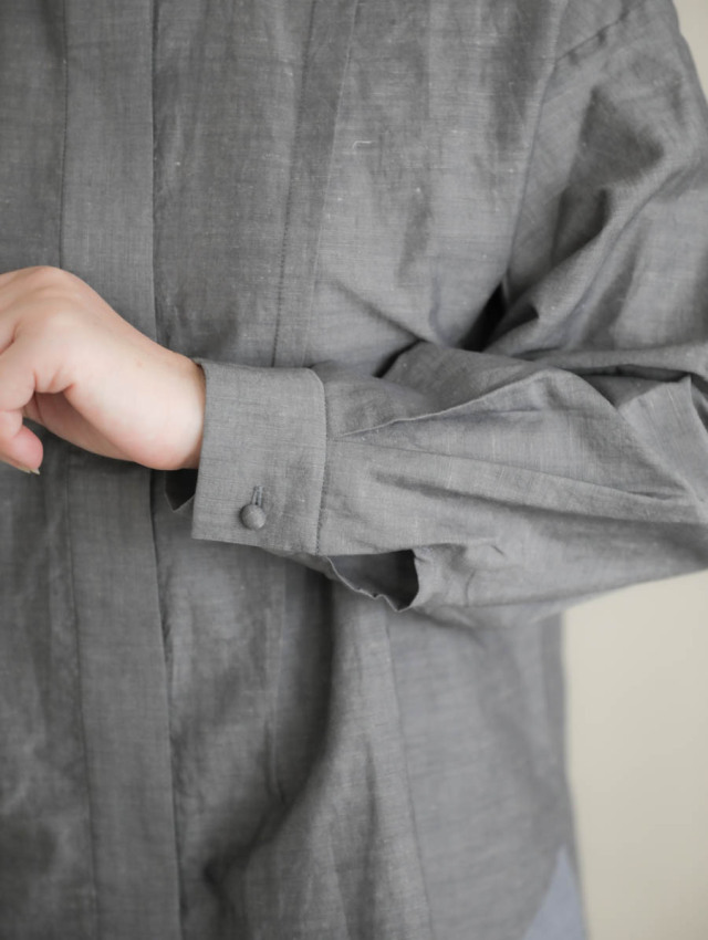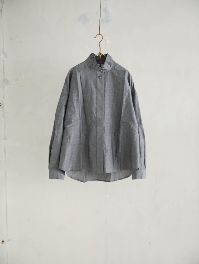 コットンリネンシャンブレーラッフルカラーブラウス(グレイ)