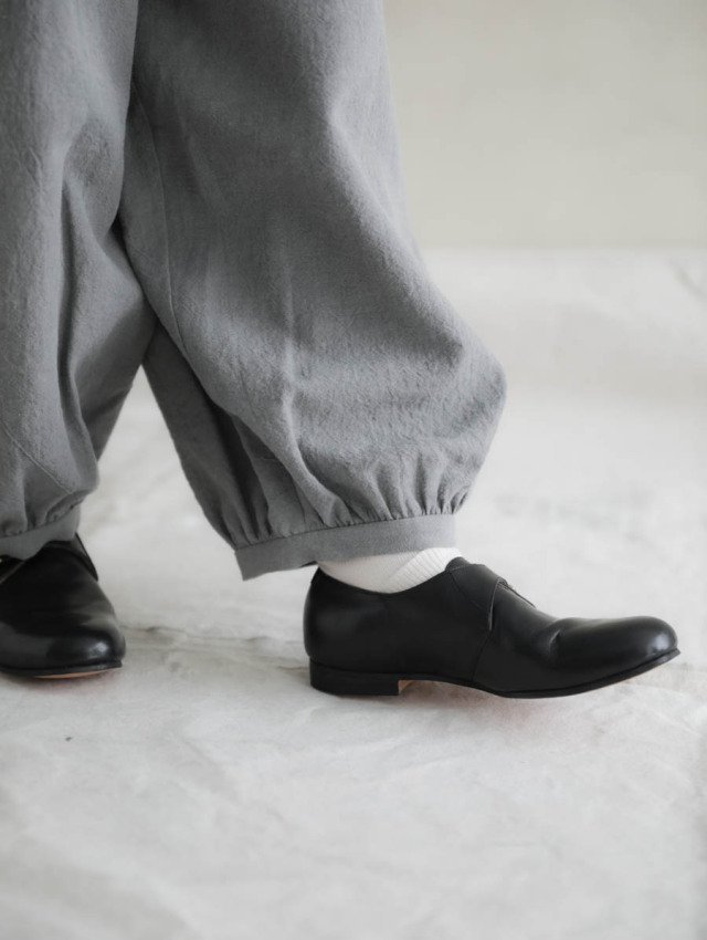 さらりとした肌触りで柔らかく軽やかな穿き心地です。備長炭染めによりヴィンテージのような渋い表情に仕上がっています。