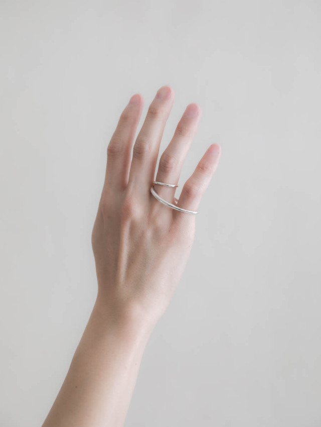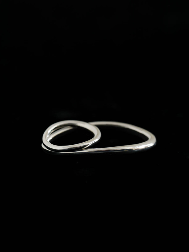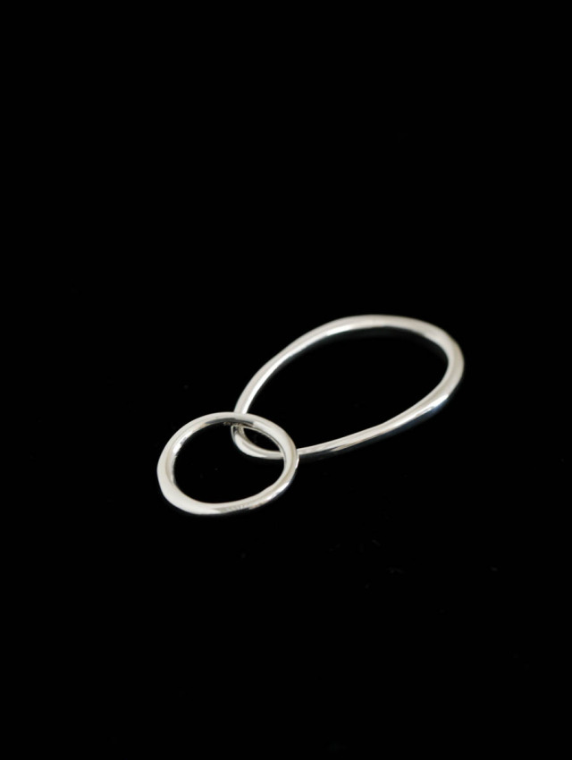 大きく軌道を描いたオーバルリング。2本の指にまたがって着けるサイズなので、取れないように丸い1連のリングを重ねて留めるデザインです。