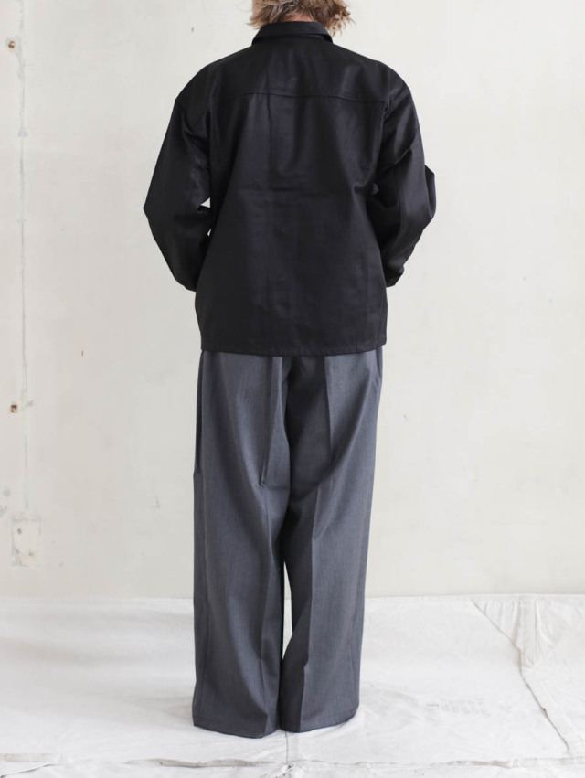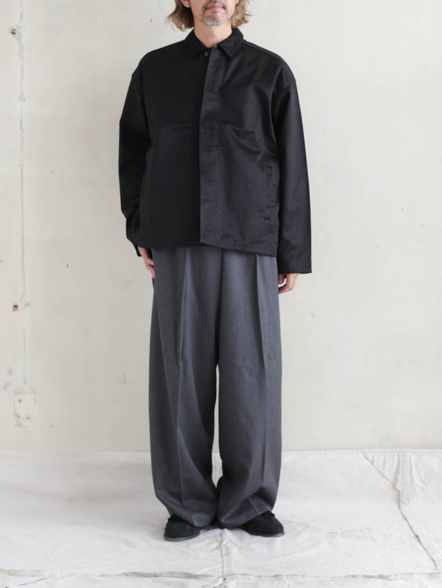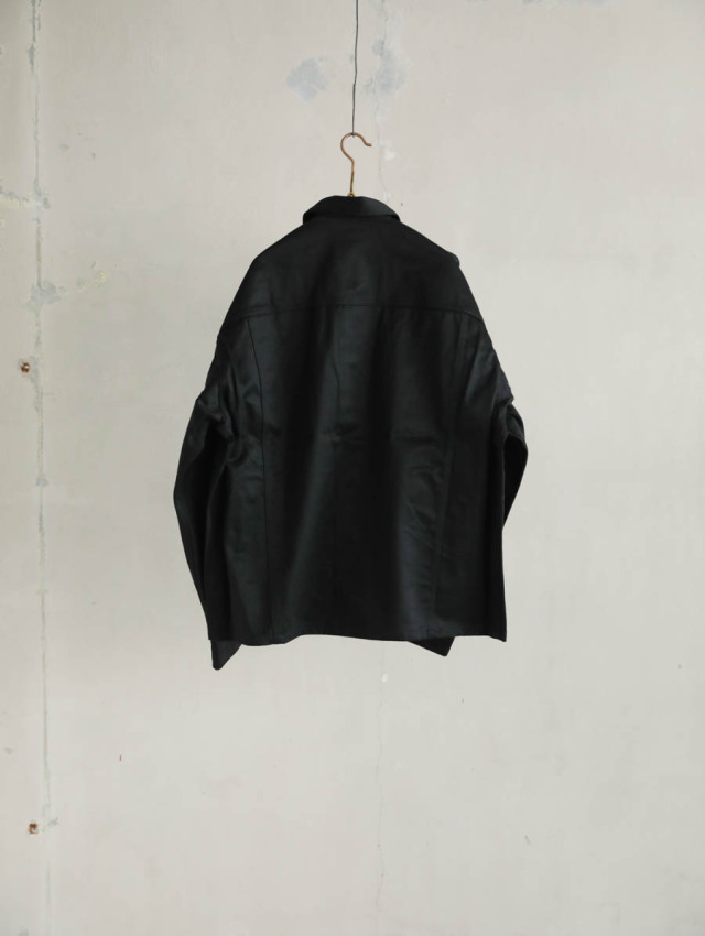 フロントは比翼仕様でボタンが隠れ、プレーン。肩が少し落ちて、身幅はワイドよりだがデザイナーの得意とするパターンメイキングで着るとスッキリとしています。