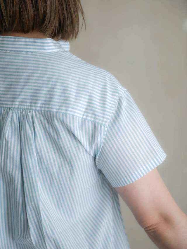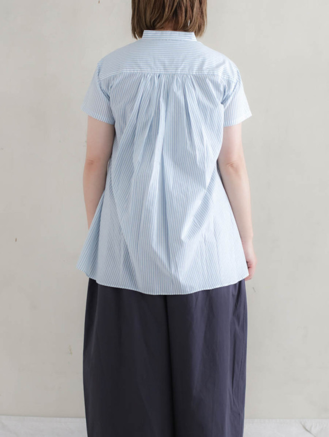 背中にギャザーが入り、裾に向かってふわっと広がるよう作られたフレアシルエットのブラウスです。