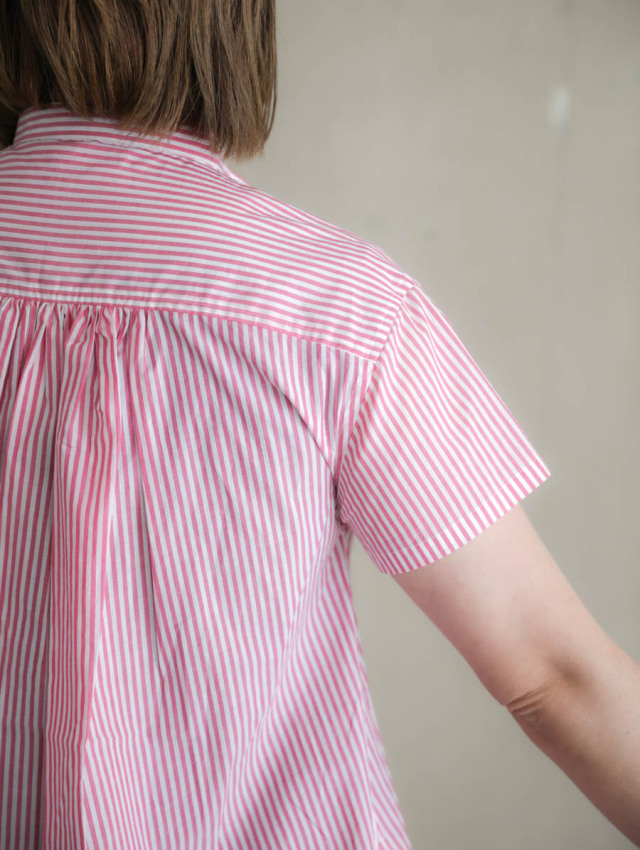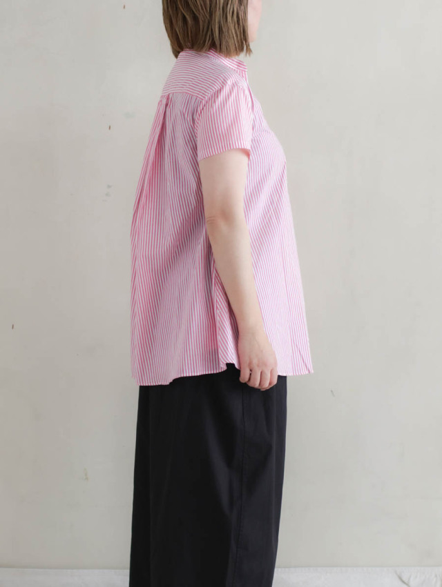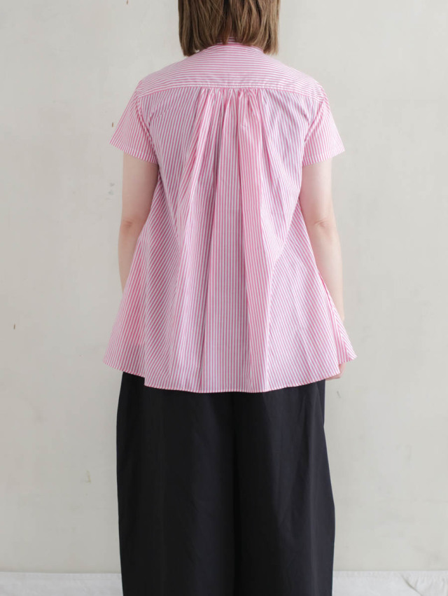 背中にギャザーが入り、裾に向かってふわっと広がるよう作られたフレアシルエットのブラウスです。