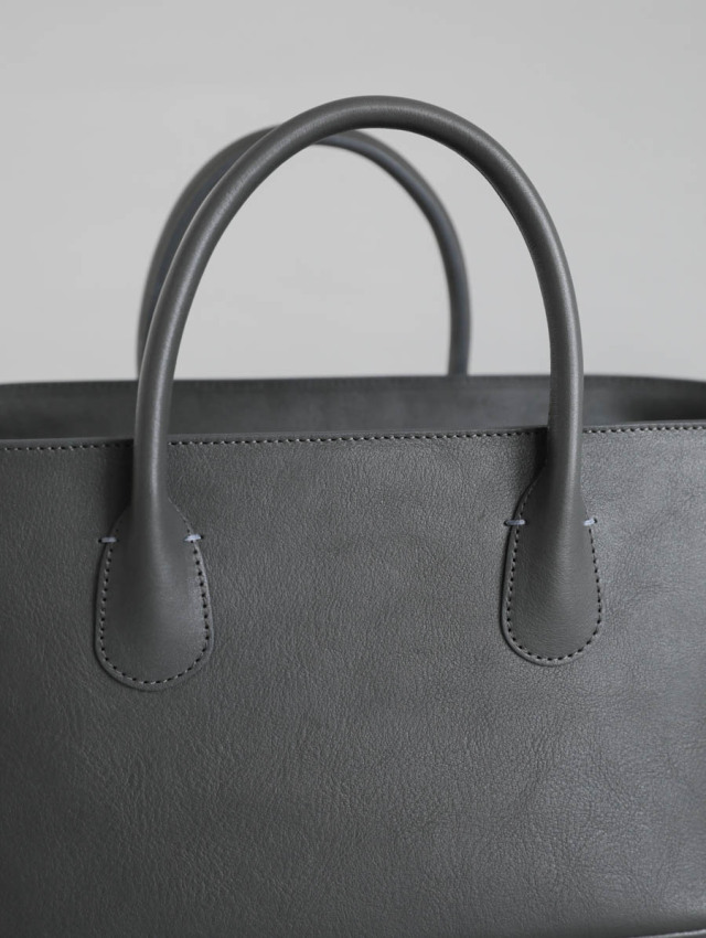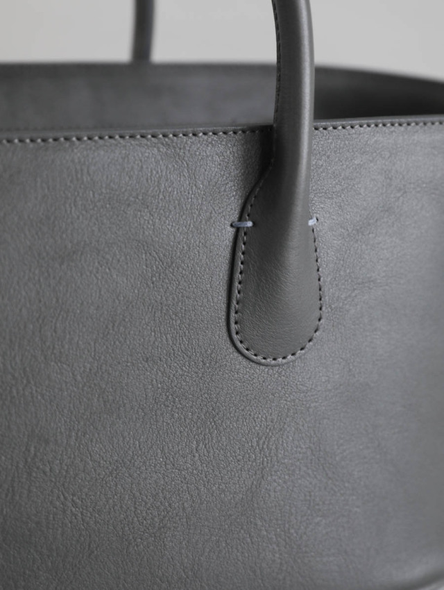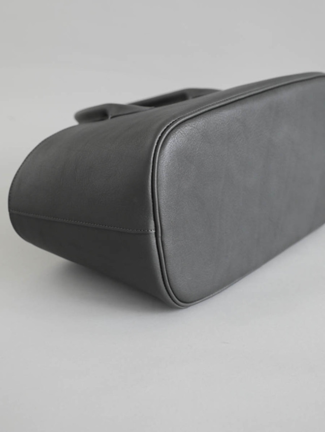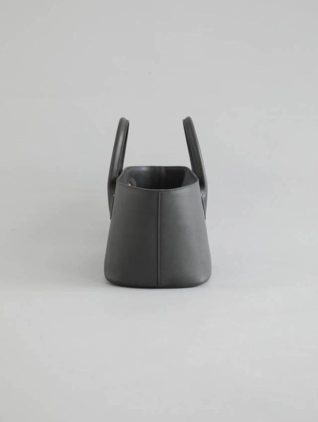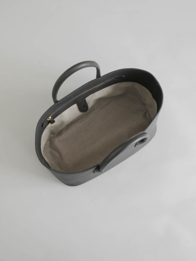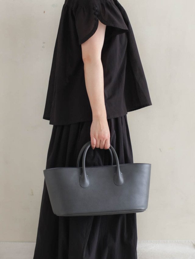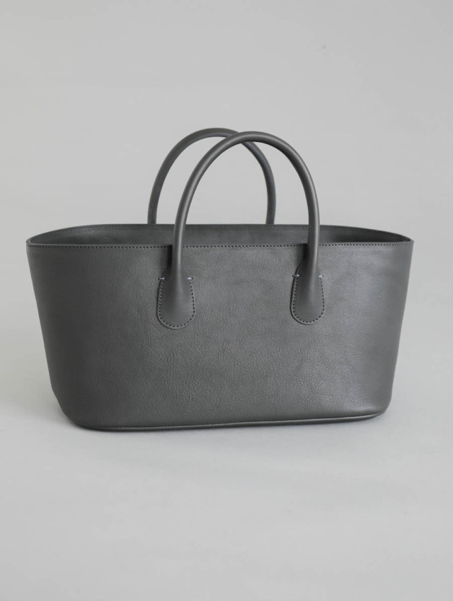 底を円形にすることにより生まれる丸みを帯びたライン。横長のフォルムは中身が見やすく取り出しもスムーズです。ハンドル部分も美しく品の良い表情です。
