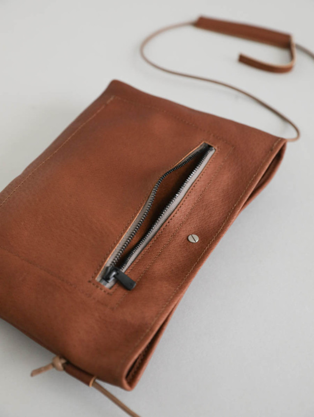 口をギボシで留めるミニマルなデザインのサコッシュ。必要最低限のものを入れて気軽に出かけることができる、使いやすいバッグです。背面にはジップポケットが付いているので、貴重品も安心して収納できます。