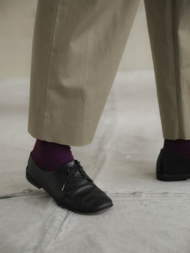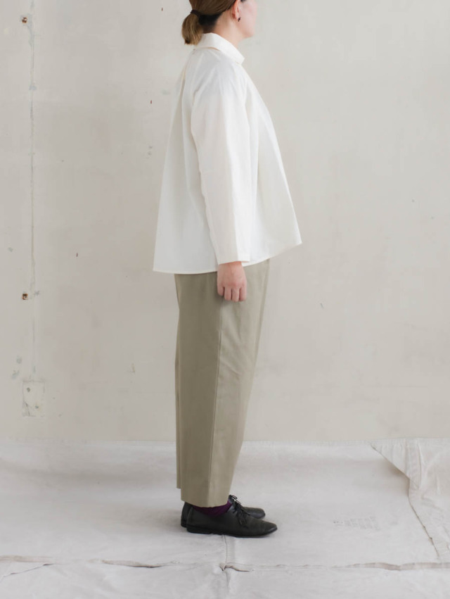 オーガニックコットンを使用した生地は、しなやかなハリと品の良い光沢。2重織りにすることで、落ち感が出るように作られています。肌触りは滑らかで柔らかな履き心地です。