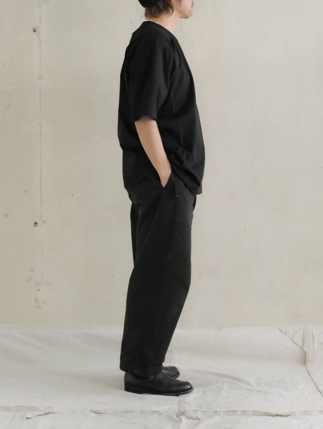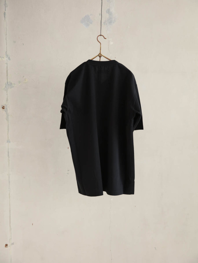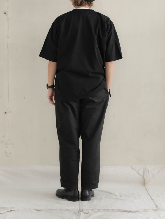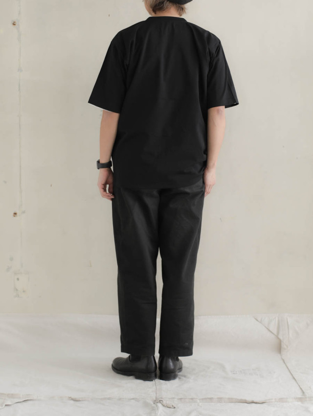 この生地の特徴はなんと言っても黄ばみがでにくいという所。経年黄変せず汚れが落ちやすいように加工されており、黒を着る上でどうしてもぶち当たる悩み”色褪せ”が出ないことを目指し、美しい黒が長く続くように仕上げています。