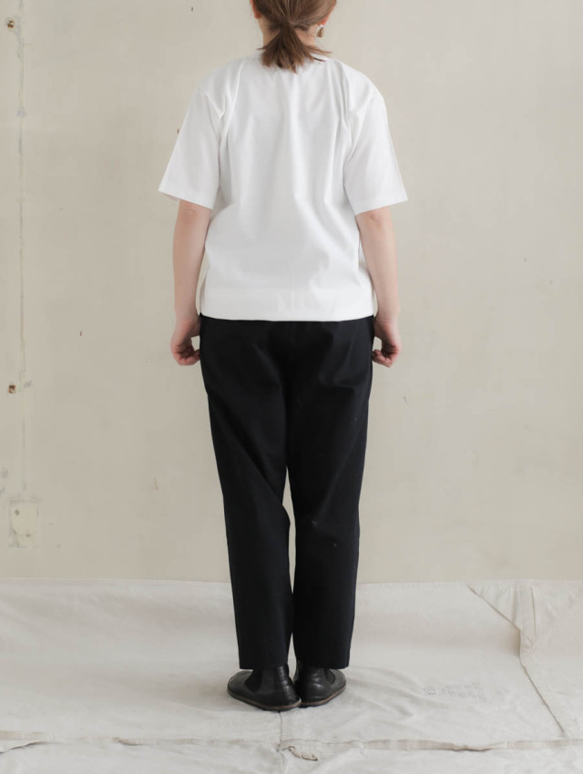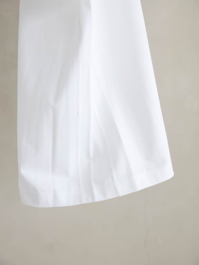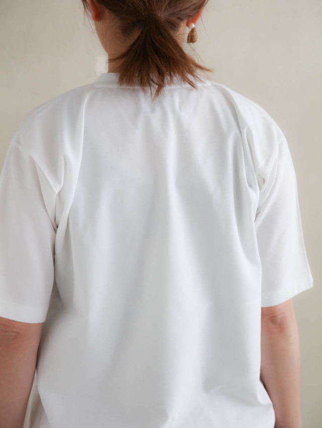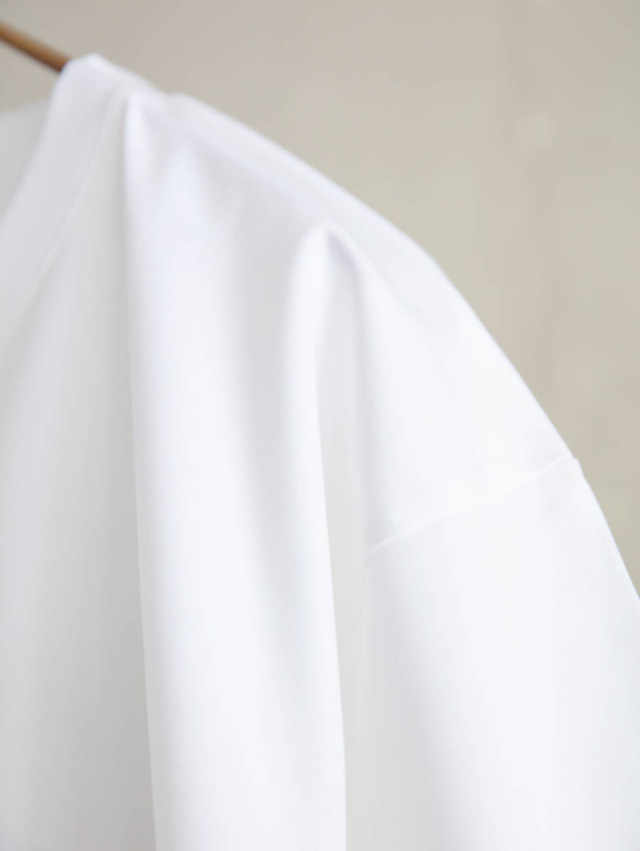 この生地の特徴はなんと言っても黄ばみがでにくいという所。経年黄変せず汚れが落ちやすいように加工されており、白を着る上でどうしてもぶち当たる悩み”黄ばみ”が出ないことを目指し、お洗濯をすれば美しい白が続くように仕上げています。