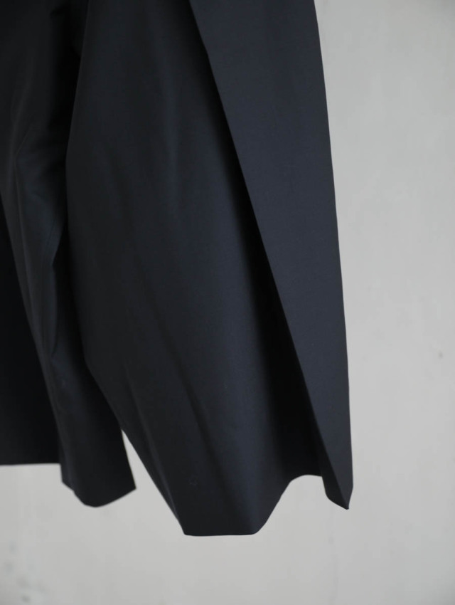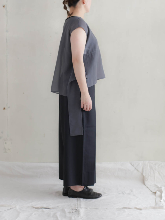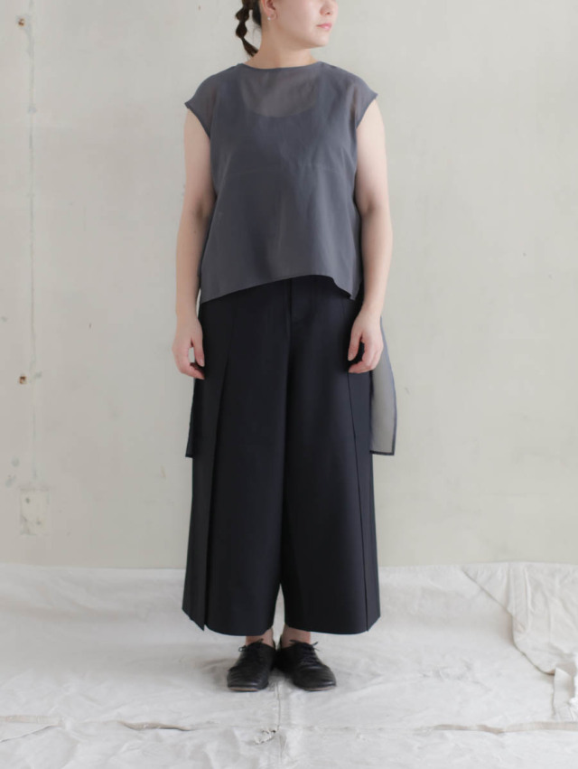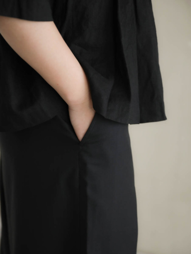 裾にかけて広がっていくワイドなライン。外側から内側に1つタックを取ることで、収まりの良いきれいなシルエットに。生地のドレープにより品の良い見え方をお楽しみいただけます。