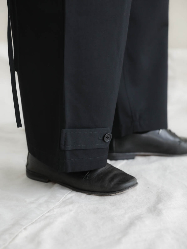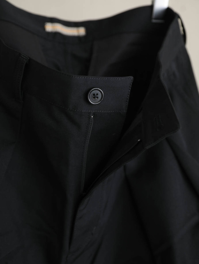 ウエストに2つ大きめのタックを取ったデザインが特徴的で、ゆとりのある腰回りからゆるやかにテーパードするきれいなライン。生地のドレープにより品の良いシルエットでご着用いただけます。