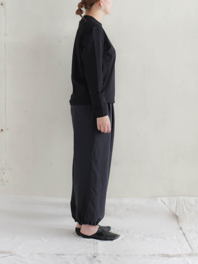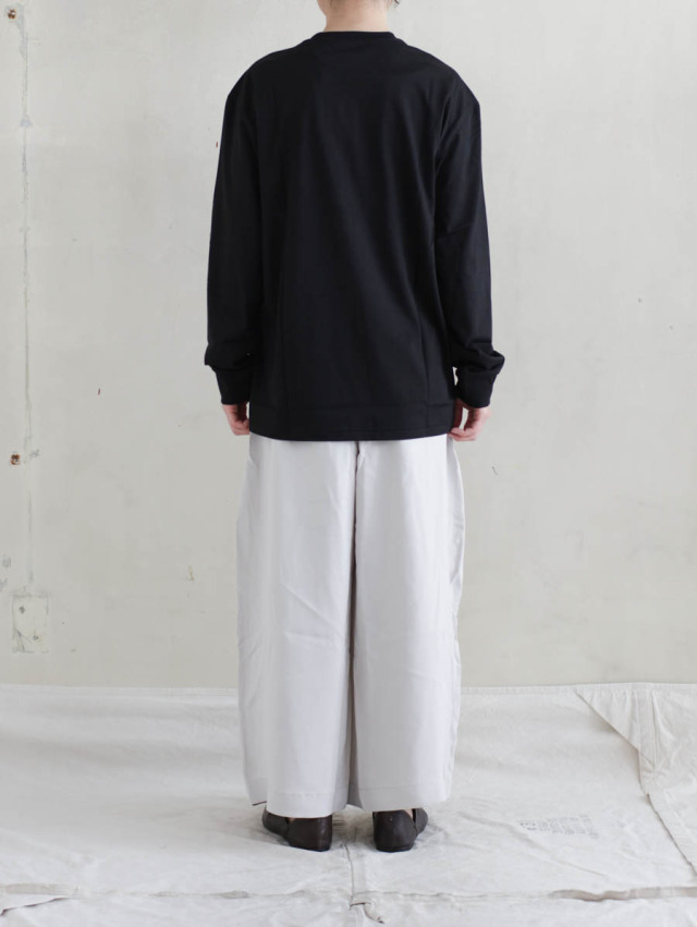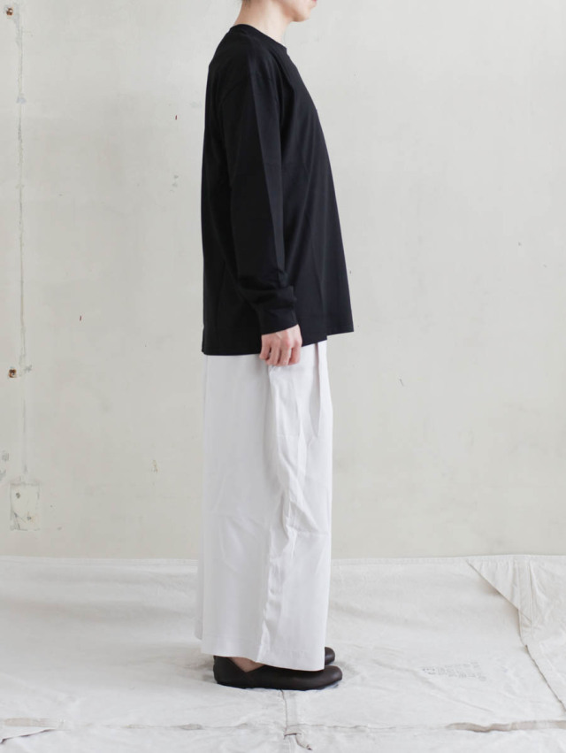 ツルッと品の良い質感のオーガニックコットン天竺。甘撚りの糸で編んだ生地は、原料の柔らかさを存分に活かし、膨らみのあるしっとりとした肌触りが気持ち良いです。滑らかで肌馴染み良く、オールシーズン快適に着ていただけます。
