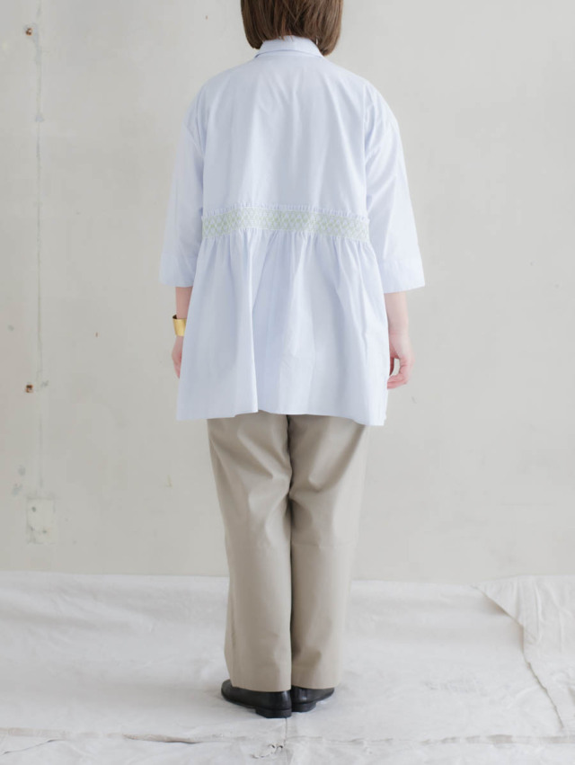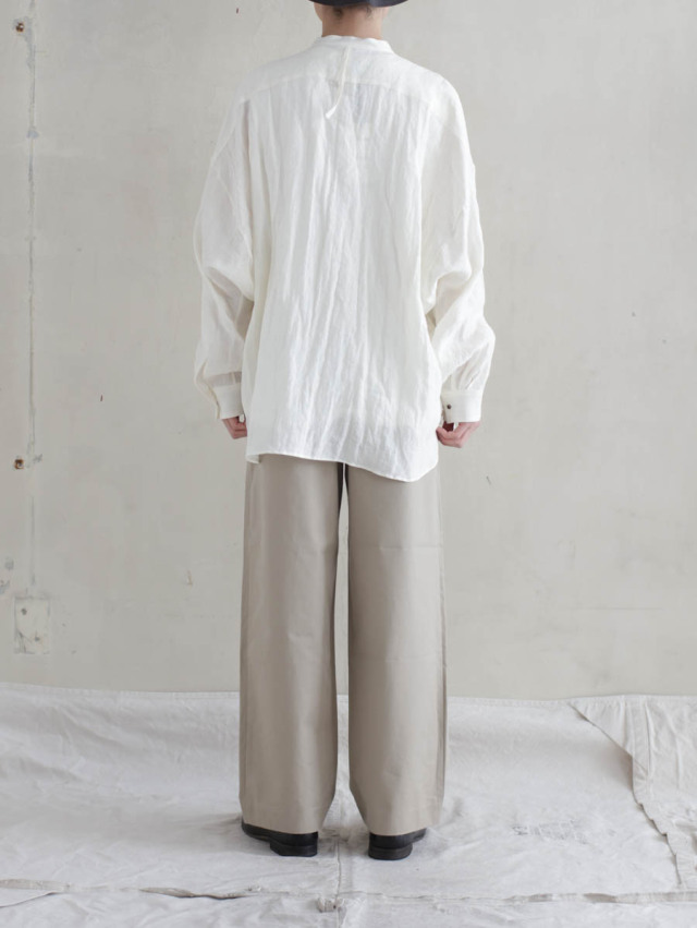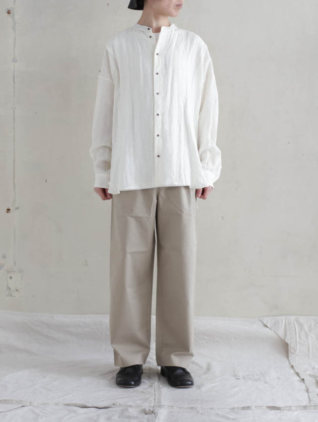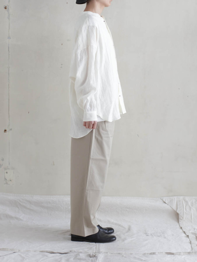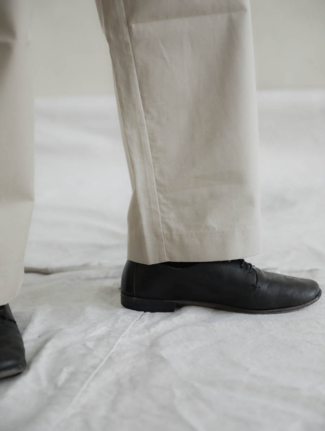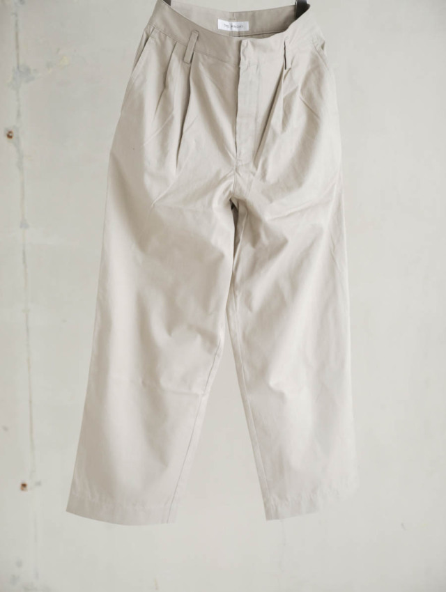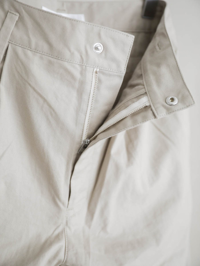 膨らみのあるチノの質感を活かして裾にかけてテーパードのかかった、美しいワイドテーパードシルエットです。スラックスのような縫製仕様も見え方を大人に仕上げてくれています。
