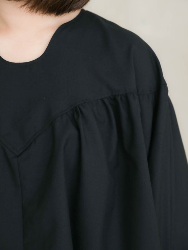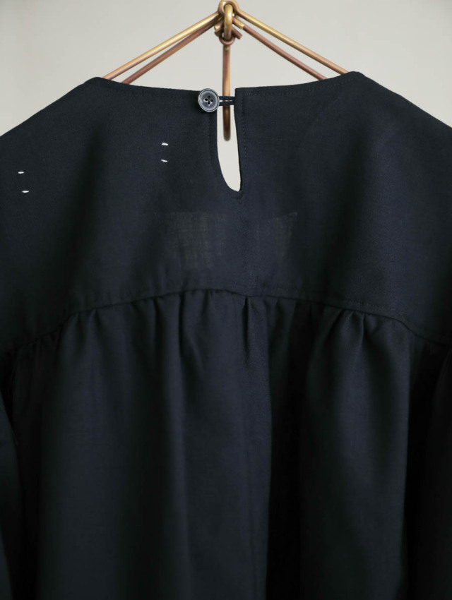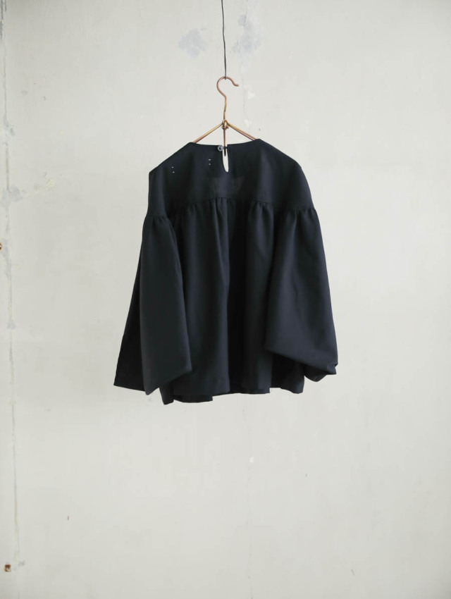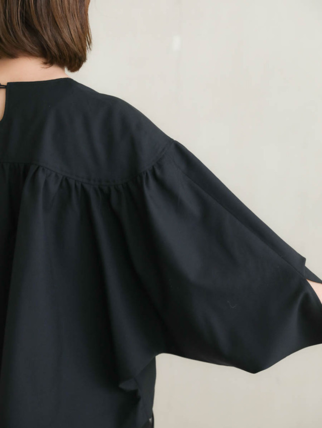 身幅は広く余裕があり、着る人の体に優しく沿う肩のライン。袖幅をたっぷりと取ったドルマンスリーブで、着用することで生まれるドレープが美しいです。