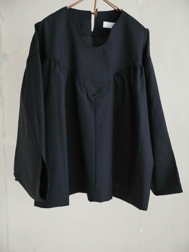 クラシカルな雰囲気でデコルテが美しい、袖のドレープも可愛らしいブラウスです。