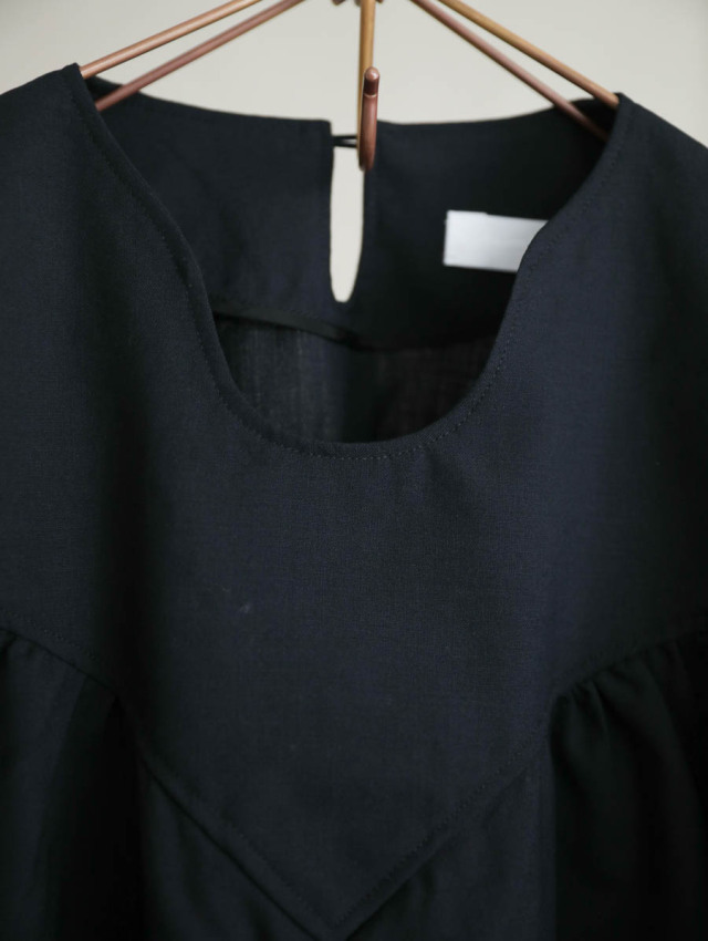 胸元にはギャザー、スリットのような袖口で見え方はクラシカルに。