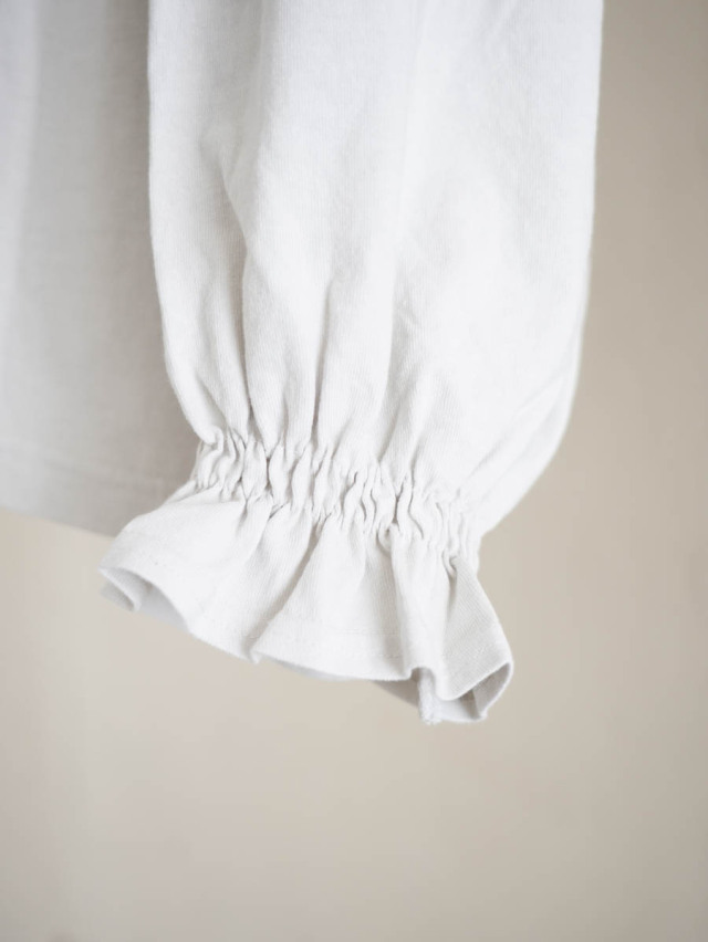 ワイドなサイズ感で、ゆったりと楽な着心地。お袖には可愛らしくギャザ―を施し、ふんわりと女性らしい印象に。袖口はシャーリングゴム仕様になっており、お好きな腕の位置に留めて、シルエットを変えてお楽しみいただけます。