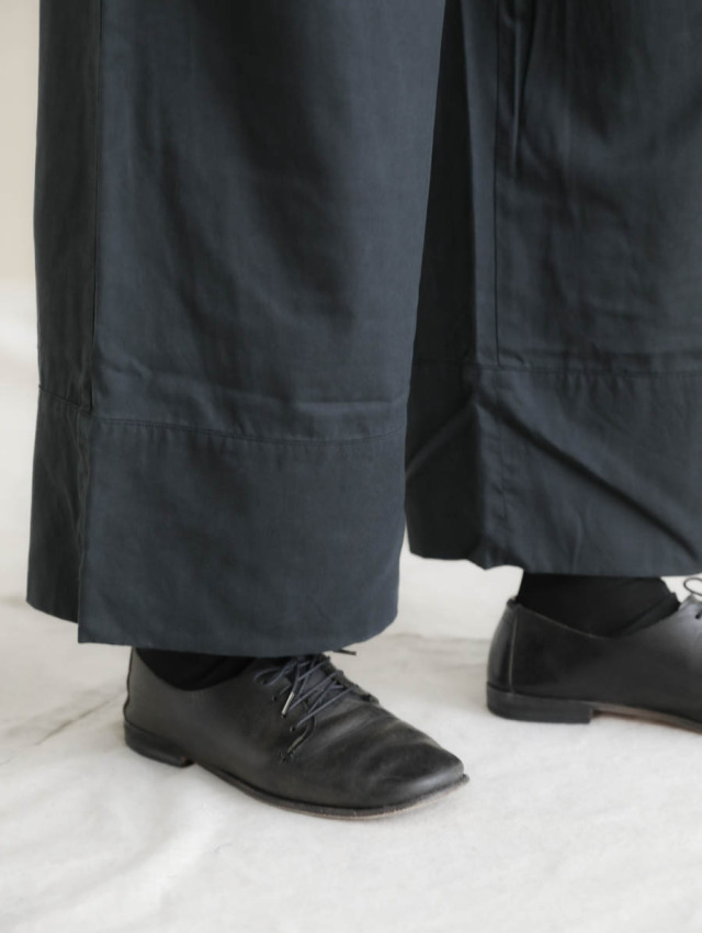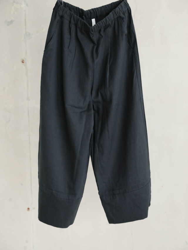 裾のカフスがポイントになり、シルエットに落ち感を生み出すワイドパンツ。