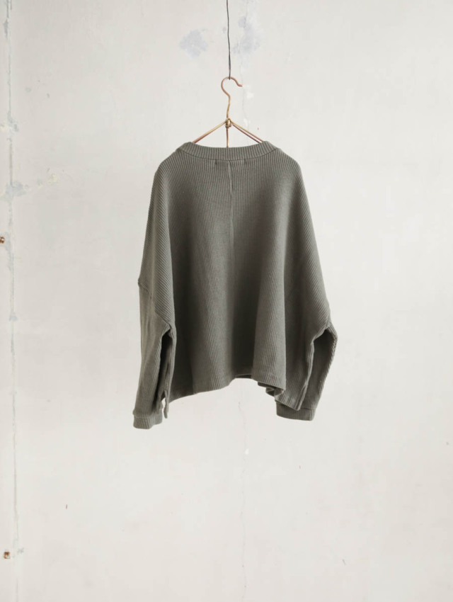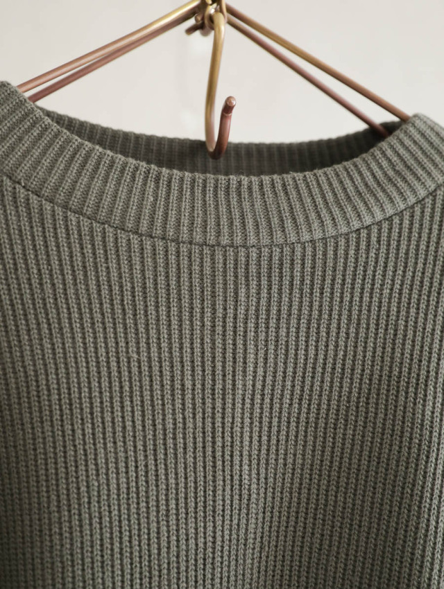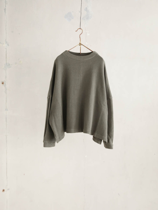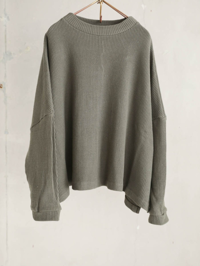 ざっくりと大きな身幅、肩幅で、ゆったりとしたシルエットのプルオーバー。