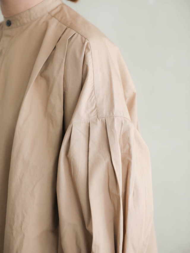 肩や袖口、背中にタックとギャザーをたっぷりといれることで、ふんわりと優しいシルエットに。