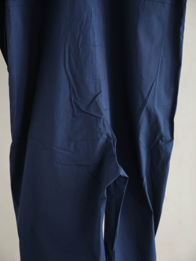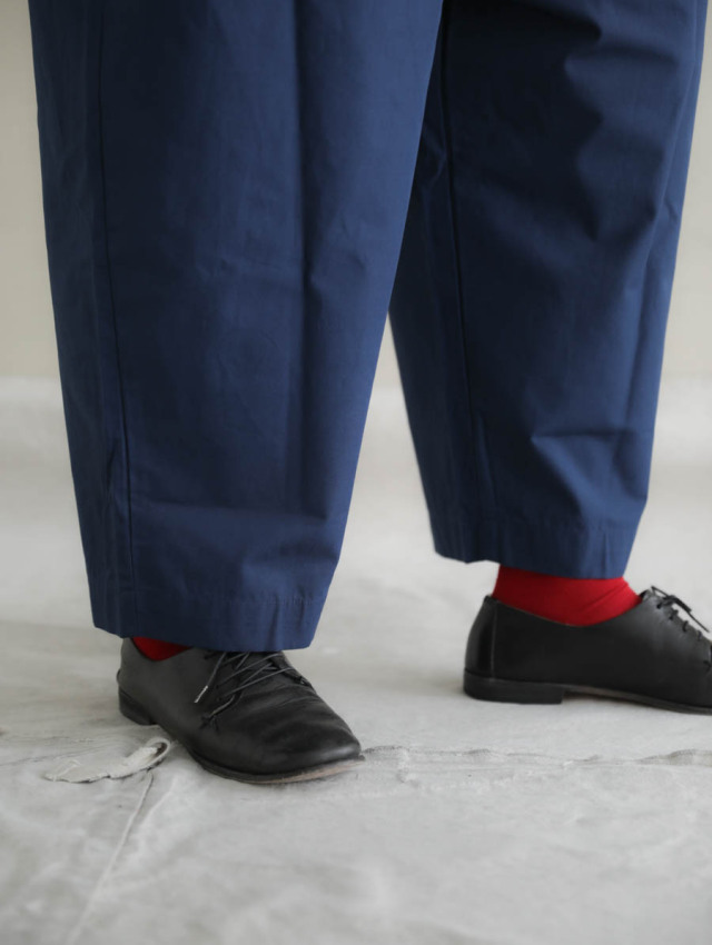 全体的にゆとりをもたせた身体のラインが出ないシルエット。トップスは身幅、肩幅が広く、首元は衿付きで引き締まった表情に。ボトムはゆったりと股上の深いサルエルで、ぽてっとした膨らみが生まれます。足元にかけてはテーパードがかかるので、ダボッとはならず収まりの良いラインです。