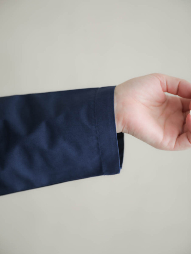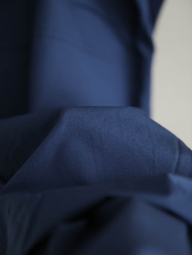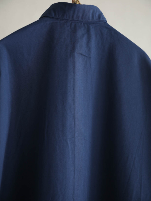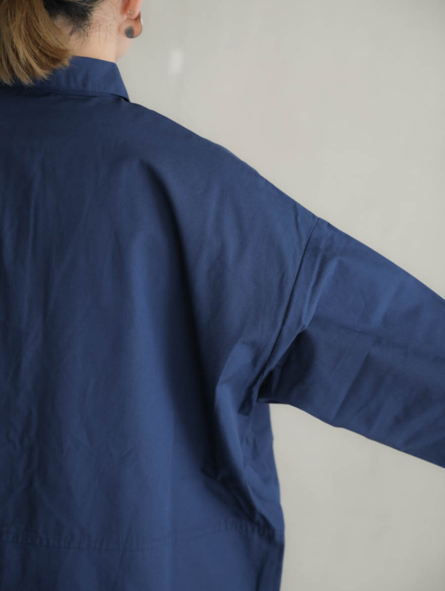 さらりとマットな質感で、膨らみと心地よいハリのある高密度コットンウェザー。しなやかな生地は袖通しよく、ロングシーズンで活躍します。 ネイビーがかったブラックは、シックな表情です。