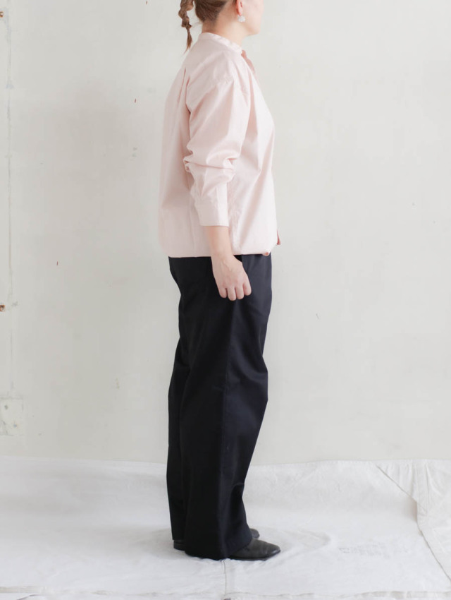 股上は深め、ウエストはゴムとひもで調節可能なイージーパンツ。裾に向かって真っ直ぐ落ちていくようなきれいなストレートシルエットです。