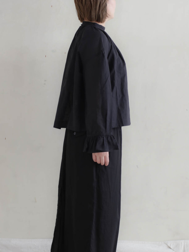 後ろボタンでフロントはすっきりと、立衿のようなシックな表情です。