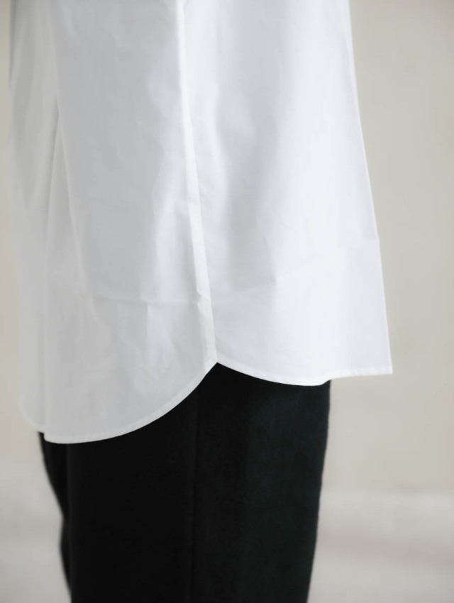 ゆったりと上品に過ごせる、丈長でスッキリとしたコットンシャツです。