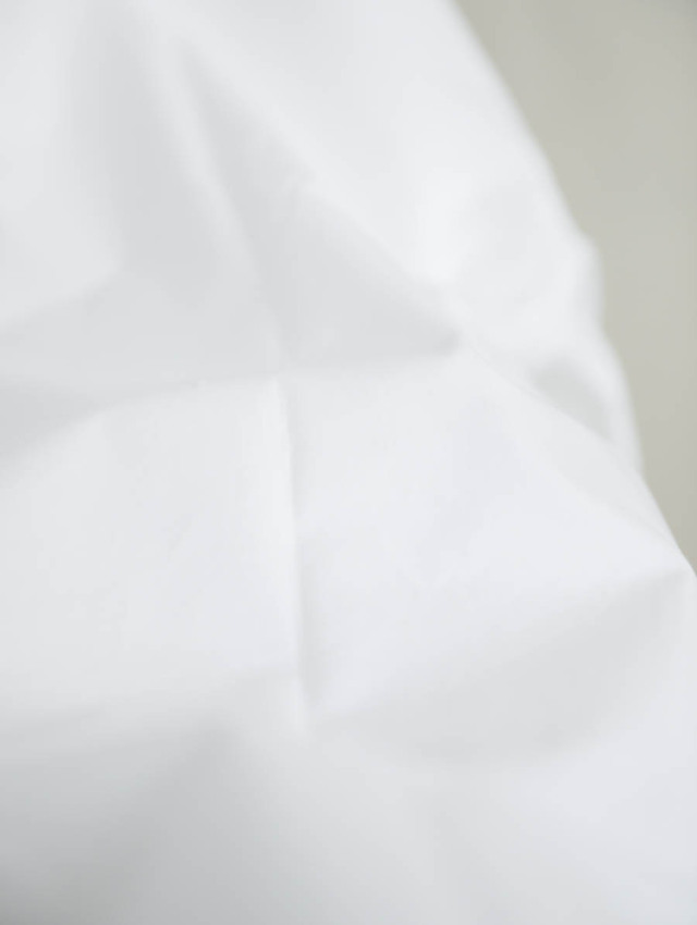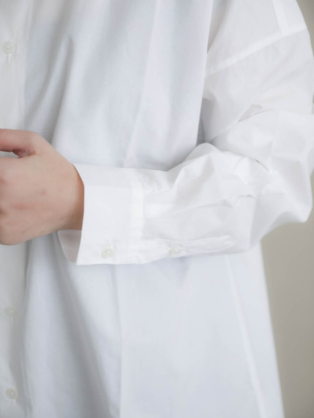 品の良い光沢のある、しなやかで肌触りの良い高密度コットンタイプライター。 肌なじみ良く軽やかで、季節を問わずご着用いただけます。